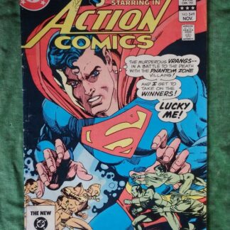 1983 DC comics, Action Comics no.545 starring Superman, …with but a Single Step! [Brainiac]. Comic in good condition. Cover has light wear. Rear cover has 2 rub lines and name in pen on border. Slight stretch on staples. All pages tight bright and clear.