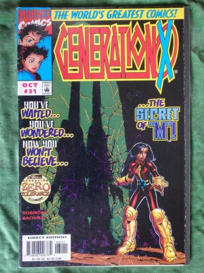 1997 Marvel comics, Generation X no.31, Zero Tolerance tie-in and the secret of M! Comic in very good+ condition. Cover has ticks to spine. All pages tight bright and clear.